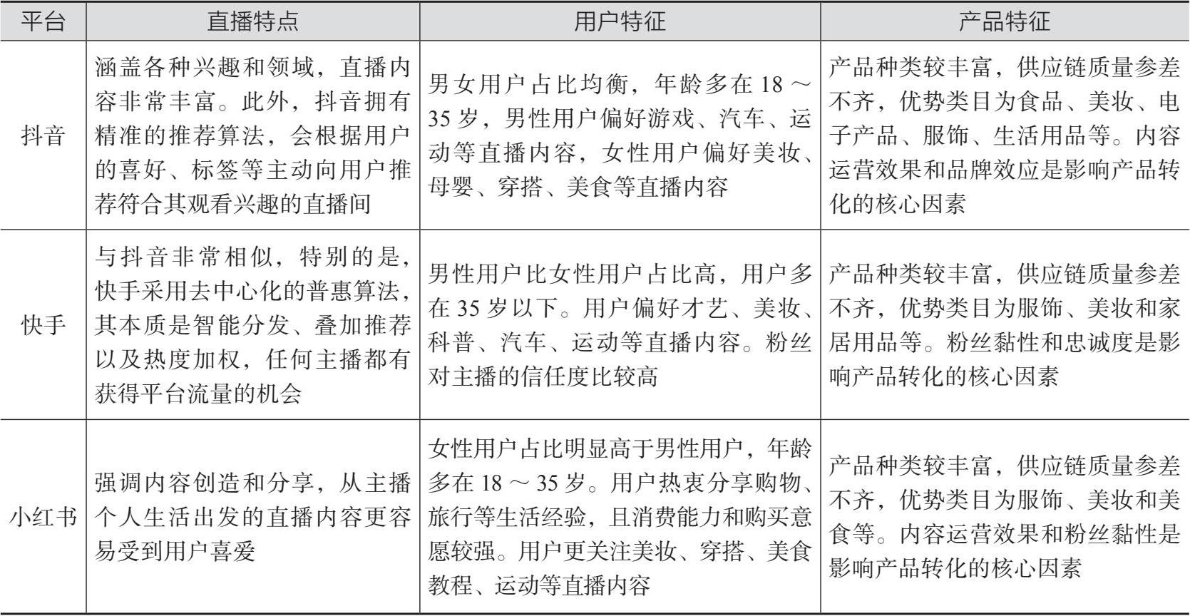 兴趣电商是一种基于人们对美好生活的向往,满足用户潜在购物兴趣,提升用户生活品质的电商。兴趣电商平台即通过丰富多彩、创意十足的内容激发用户的潜在兴趣,引导用户在轻松愉快的氛围中购物的平台,包括抖音、快手、小红书等。在这类平台中,内容是获取用户流量的重要工具,直播用于促进成交和转化。表1-3所示为抖音、快手、小红书等主流兴趣电商平台的相关特点。