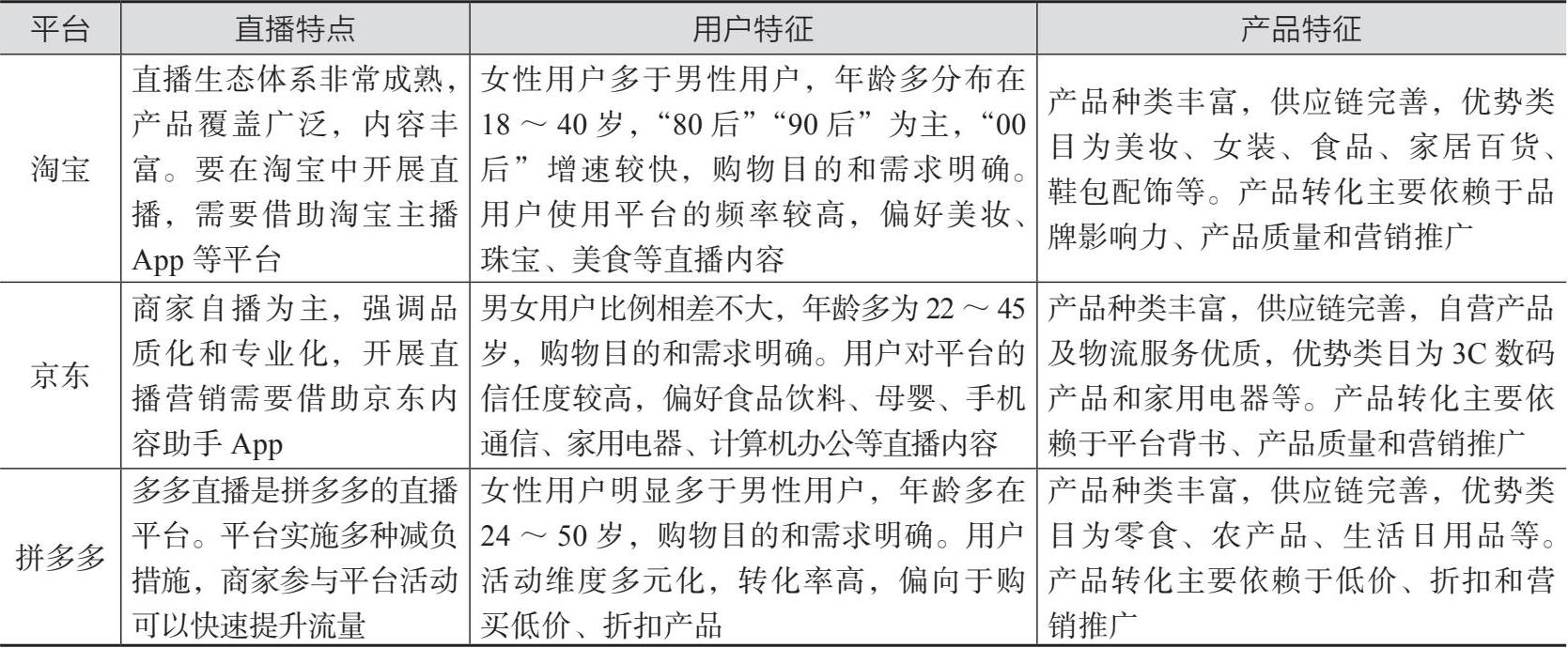 传统电商平台指推出直播功能的电商平台,如淘宝、京东、拼多多等平台。这类平台具有较强的营销性质。用户在平台上观看直播的目的十分明确,就是购买产品,这使得传统电商平台在直播营销活动中具有先天优势。同时,借助直播,传统电商平台也可以吸引更多流量,获得更多的用户,并增强用户对平台的黏性。表1-2所示为淘宝、京东、拼多多等主流传统电商平台的相关特点。
