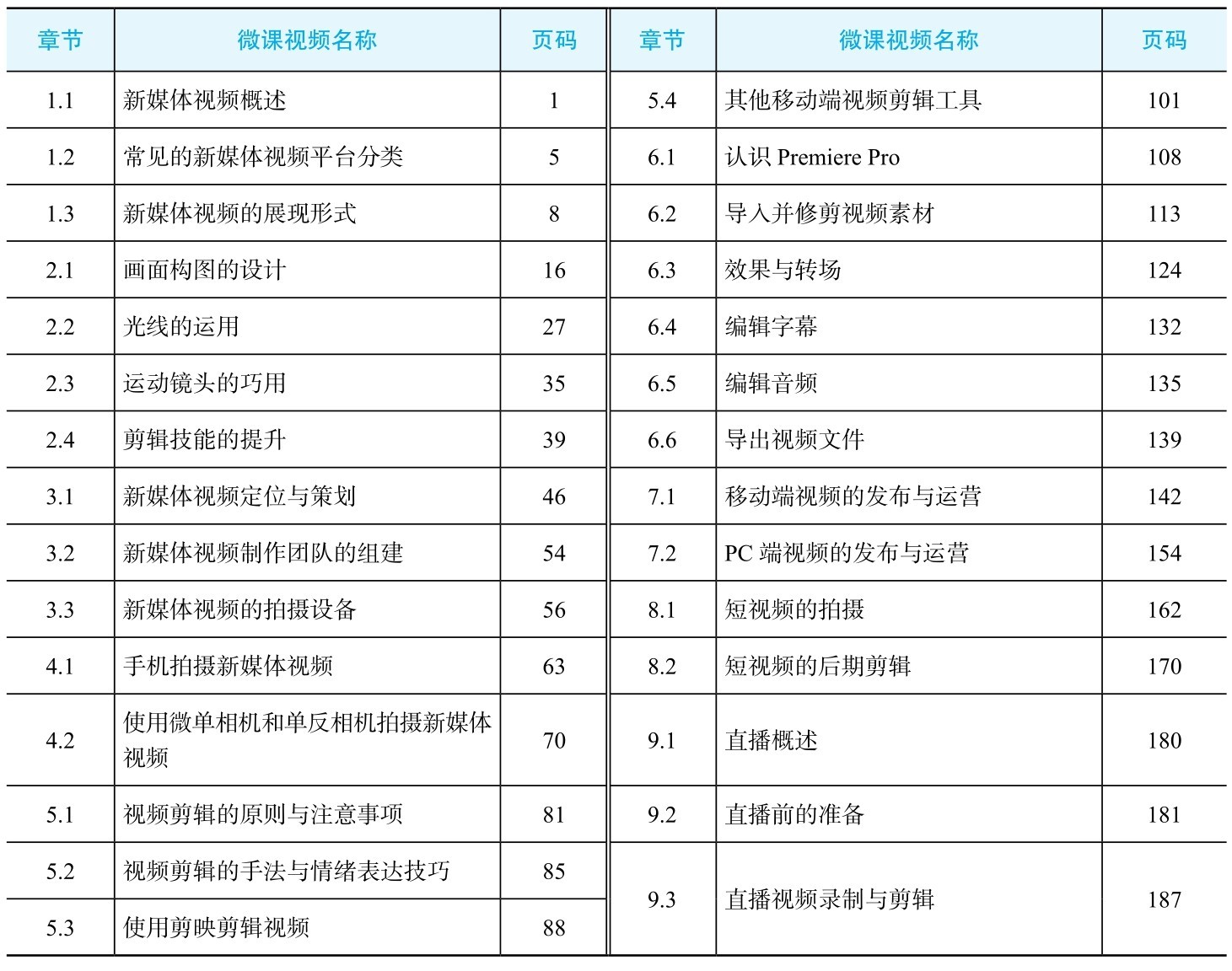 新媒体视频行业的快速发展,对新媒体视频策划、拍摄、剪辑等人才的需求也不断加大。为了更好地帮助相关专业培养人才和满足行业需求,编者特意编写了本书。