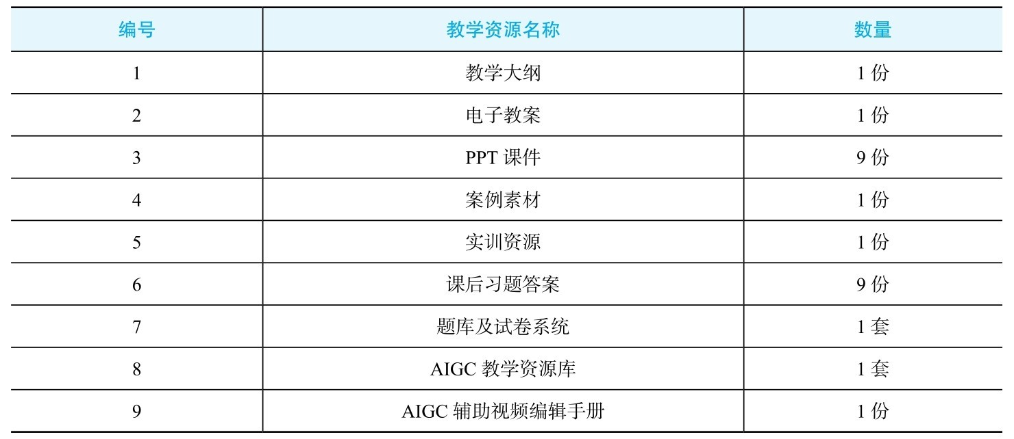 为了方便教学,编者特意为使用本书的教师提供了丰富的教学资源,精心制作了教学大纲、电子教案、PPT课件、案例素材、实训资源、课后习题答案、题库及试卷系统、AIGC教学资源库、AIGC辅助视频编辑手册等教学资源,教学资源名称及数量如表1所示。用书教师如有需要,请登录人邮教育社区(www.ryjiaoyu.com)搜索书名获取相关教学资源。需要注意的是,本书正文所有素材均来源于教学资源中的案例素材。