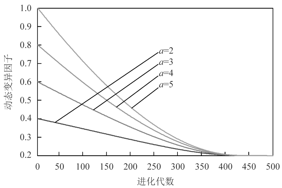 式中, F 0 为变异因子系数; a 为幂底数; λ 为幂指数; t 为进化代数; G 为最大进化代数。当 F 0 =0.2, a =2,3,4,5, G =500时,动态变异因子变化曲线如图3-3所示。