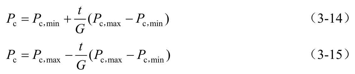 式(3-14)中交叉概率 P c 随着进化代数的增加,从 P c,min 线性增大到 P c,max ,搜索初始阶段目标向量对试验向量的贡献大,而到了搜索后期,合成向量对试验向量的贡献大。而式(3-15)中交叉概率 P c 随着进化代数的增加,从 P c,max 线性减小到 P c,min ,搜索初始阶段合成向量对试验向量的贡献多,而到了搜索后期,目标向量对试验向量的贡献多。