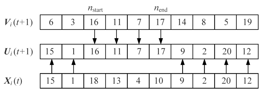 式中, n start 为交叉起点位置, n end 为交叉结束位置。在中间个体的合成向量中随机找到一个起点位置 n start ,从 n = n start 开始,如果生成的随机数满足rand≤ P c ,则 n = n +1,连续进行上述操作,直到在某个分量位置出现rand> P c 或到达向量尾部为止,此时 n = n end ,则试验向量 U i ( t +1)对应位置分量就从合成向量 V i ( t +1)中抽取这一段连续的对应位置分量,其他位置分量取目标向量 X i ( t )对应位置的分量,如图3-2所示。