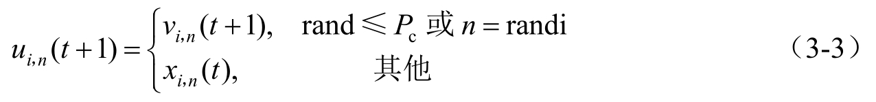 式中,rand为均匀分布随机数,rand∈[0,1]; P c 为交叉概率或交叉因子, P c ∈[0,1];randi为随机整数,randi∈[1, N ]用来确保 u i , n ( t +1)中至少从 v i , n ( t +1)中获得一个分量。