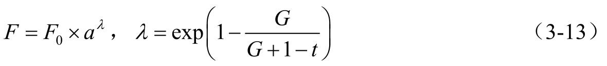 由图3-3可见,在算法开始时自适应变异因子近似为 aF 0 ,随着算法进化代数增加,变异因子逐步降低,到进化结束时近似为 F 0 。相当于差分向量的权重由大变小,在算法前期有助于加速向最优解靠拢,而在算法后期有助于在最优解附近细致搜索。
