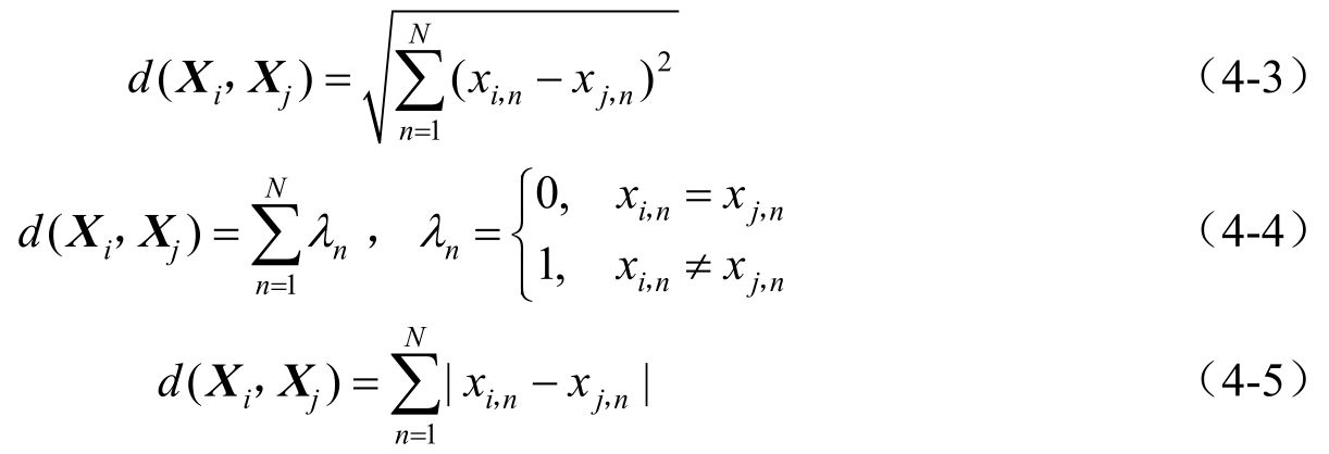 根据抗体编码形式的不同,两个抗体个体之间的常用距离包括欧氏距离(Euclidean Distance)、汉明距离(Hamming Distance)、曼哈顿距离(Manhattan Distance),计算公式分别为