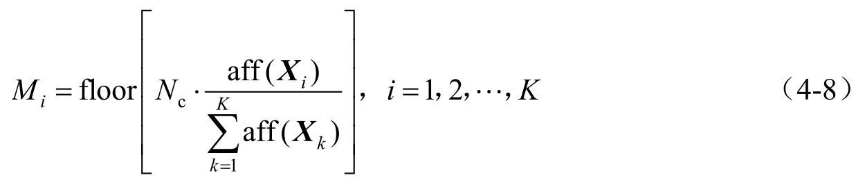 式中, K 为免疫选择算子选中的抗体数量; N c 为抗体克隆总倍数;aff( X i )为抗体 X i 的亲和力; M i 为抗体 X i 的克隆倍数;floor(·)表示沿-∞方向取整。
