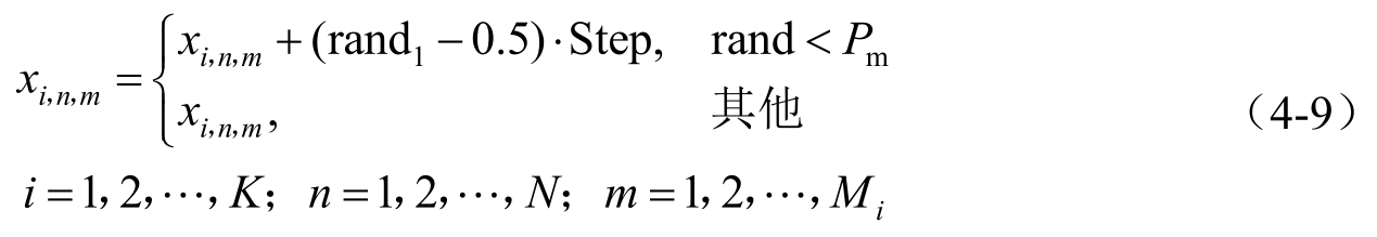 式中, x i , n , m 为抗体 X i 第 m 个克隆个体的第 n 维分量; K 为被免疫选择算子选中进行克隆的抗体数量; N 为抗体编码长度; M i 为抗体 X i 的克隆倍数;rand和rand 1 均为均匀分布随机数,rand∈[0,1],rand 1 ∈[0,1];Step为变异步长; P m 为克隆变异概率。