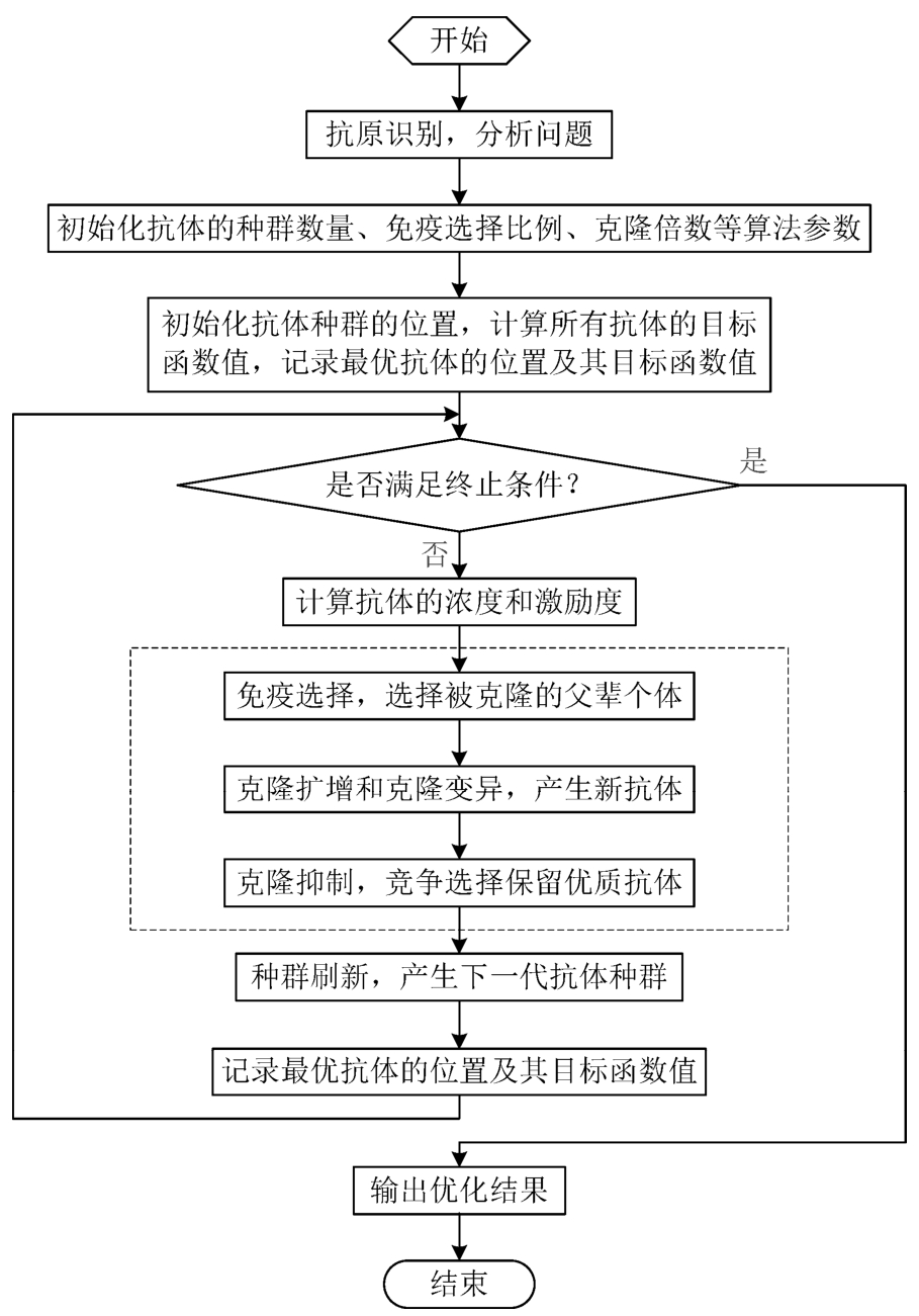 (3)初始化抗体种群的位置:利用随机原则或根据问题的先验知识,在搜索范围内给定抗体种群的初始位置。计算所有抗体的目标函数值,记录最优抗体的位置及其目标函数值。