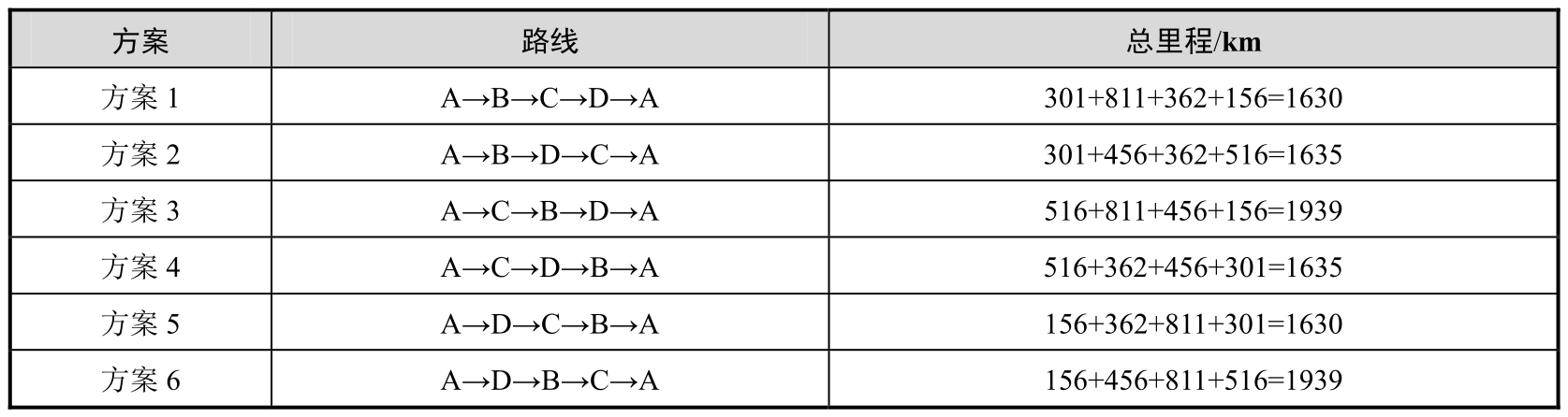 某人想利用假期在4个城市自驾游,从城市A出发,途经城市B、城市C和城市D,最后再回到城市A,4个城市之间的距离如表1-3所示。为了节约时间和出行成本,需要进行路线规划,选择一条总里程最短的路线。