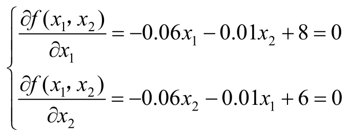 (4)求解模型。对 f ( x 1 , x 2 )求偏导数,并令其取值为0,得到下列方程组