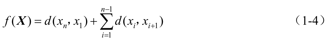 问题3 旅行商问题(Traveling Salesman Problem,TSP)。给定城市个数 n 和各城市之间的距离,旅行商要到这些城市推销货物,从某城市出发,其余各城市都要经过且仅经过一次,然后回到出发城市,求其最短行程。即寻找一条巡回路径 X =[ x 1 , x 2 ,…, x n ],使得下列目标函数最小: