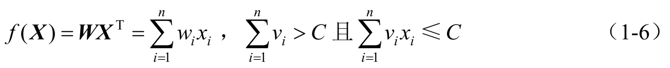 设第 i 种物品的体积和价值分别为 v i 和 w i , i =1,2,…, n ,则物品的体积向量为 V =[ v 1 , v 2 ,…, v n ],价值向量为 W =[ w 1 , w 2 ,…, w n ]。物品的选择向量为 X =[ x 1 , x 2 ,…, x n ],如果第 i 件物品被选中,则 x i =1,如果第 i 件物品未被选中,则 x i =0。背包问题就是使下列目标函数最大:
