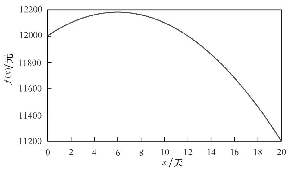 (4)求解模型。在区间 x ∈[0,∞)上, f ( x )存在唯一的最大值,其导函数为 f ′( x )=-10 x +60,令 f ′( x )=0,求得 x =6时, f ( x )取得理论最大值为12180。如果将式(1-1)改写为
