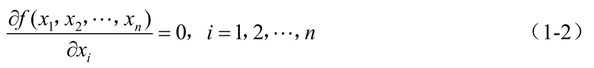 利用式(1-2)可以得到 n 个方程的联立方程组,只要解出相应的未知数,就可以求出极大值或极小值。在实际应用中,求解多元函数的最大值或最小值时同样需要综合考虑函数在极值点、边界点和不可微点的取值情况。