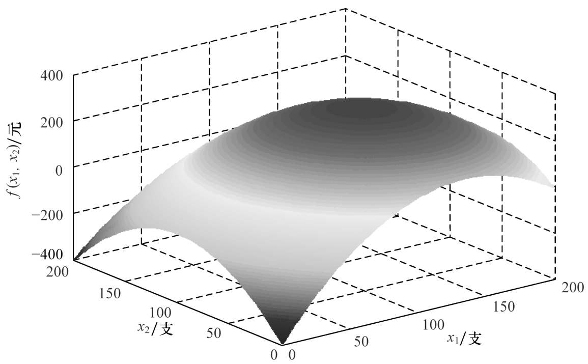 在此,令 x 1 = s , x 2 = t 为决策变量, f ( x 1 , x 2 )= Z 为目标函数,即可将钢笔生产数量问题转换为在定义域 S ={( x 1 , x 2 ): x 1 ≥0, x 2 ≥0}上求 f ( x 1 , x 2 )的最大值问题。模型的数学表达式为
