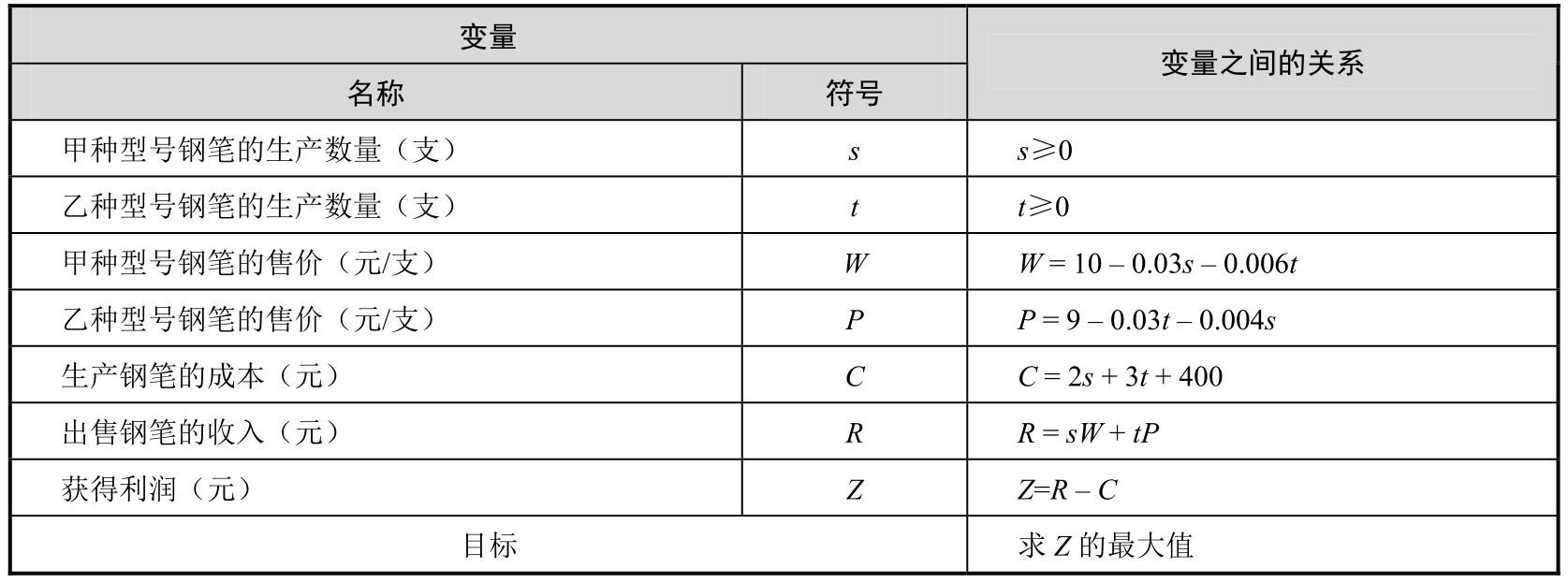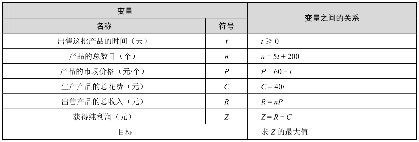 (3)推导模型的数学表达式。根据表1-2所示变量之间的关系,获得利润为