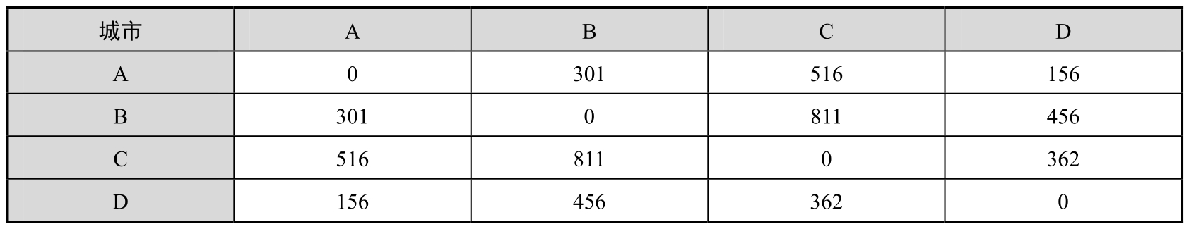 某人想利用假期在4个城市自驾游,从城市A出发,途经城市B、城市C和城市D,最后再回到城市A,4个城市之间的距离如表1-3所示。为了节约时间和出行成本,需要进行路线规划,选择一条总里程最短的路线。