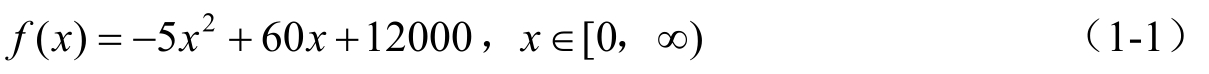 (4)求解模型。在区间 x ∈[0,∞)上, f ( x )存在唯一的最大值,其导函数为 f ′( x )=-10 x +60,令 f ′( x )=0,求得 x =6时, f ( x )取得理论最大值为12180。如果将式(1-1)改写为