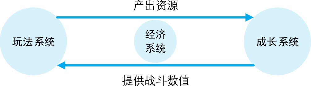 玩法系统→成长系统:通过玩法产出资源,推动成长。