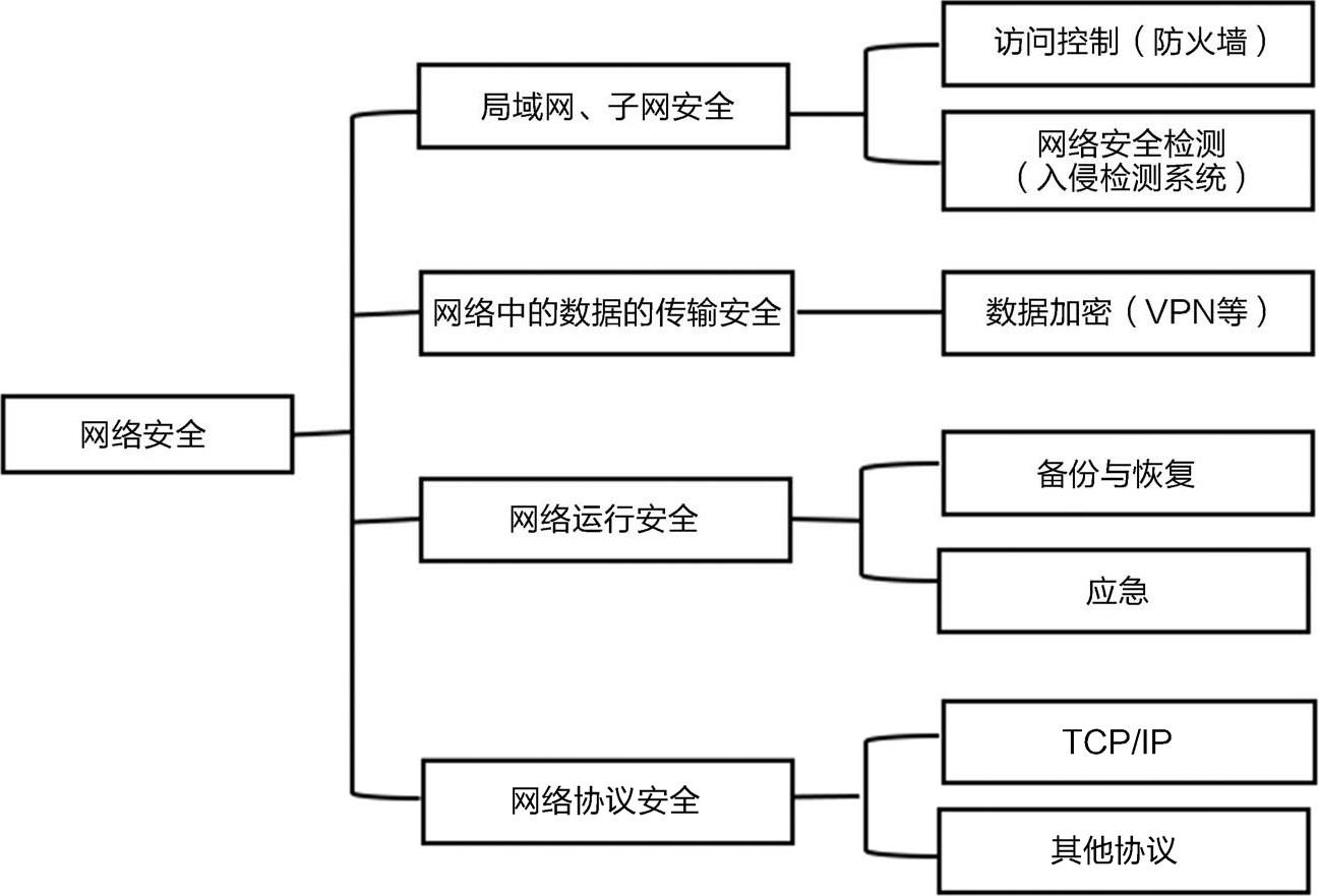 网络安全不仅包括对网络硬件的防护,还包括对网络运行安全的保障。其核心目标是确保网络传输中的数据的安全,并对系统访问进行严格控制。为保障网络的安全性,必须有效隔离内部网络与外部网络,并严格控制二者之间的访问权限。图1-1所示为网络安全的组成,下面对常见的维护网络安全的措施进行介绍。
