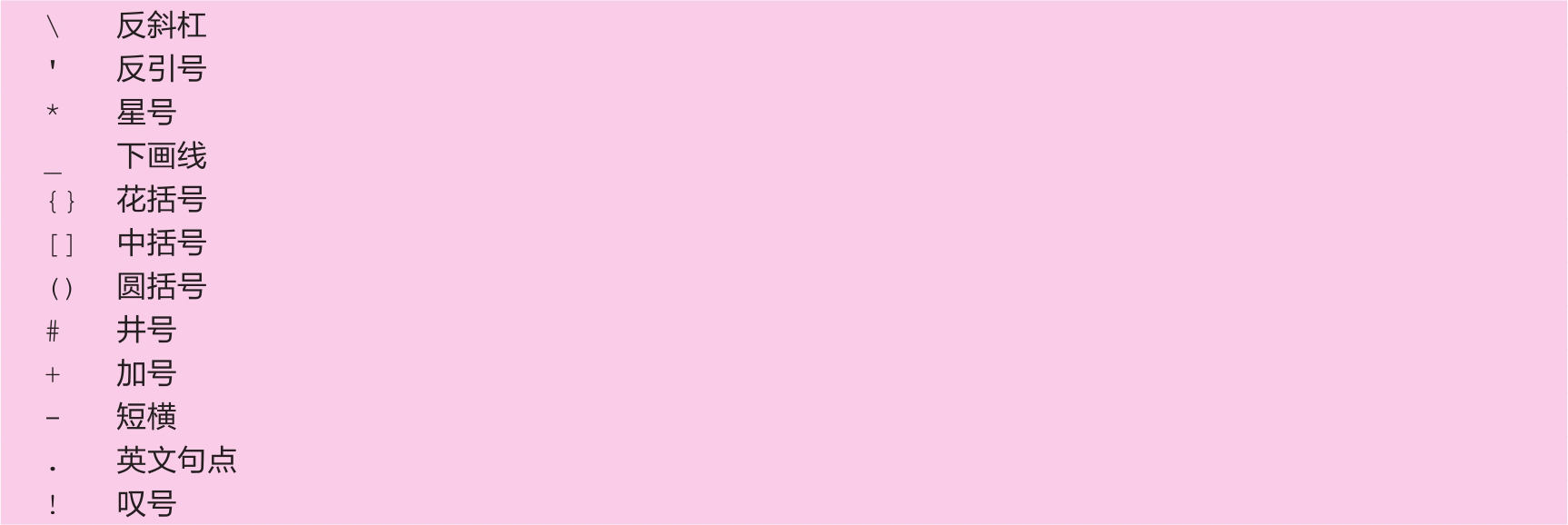 Markdown可以使用标记符号来标记内容,但如果内容本身就是标记符号怎么办呢?例如,内容为星号(*)、井号(#)、减号(-)等。如果不想让这些符号被渲染,那么除了使用反引号(`)把特殊符号当成行内代码包裹,还可以使用反斜杠(\)将这些符号转义。语法格式如下。