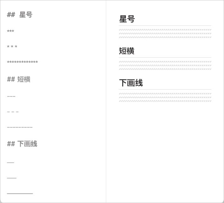 分割线用来分割文章内容。如果文章的前后语义差别比较大,则可以用分割线来区分。在Markdown中,分割线由3个以上的星号(*)、短横(-)、下画线(_)标记,如图3-10所示,行内不能有其他的字符,可以在标记符中间加上空格。使用分割线的语法格式如下。