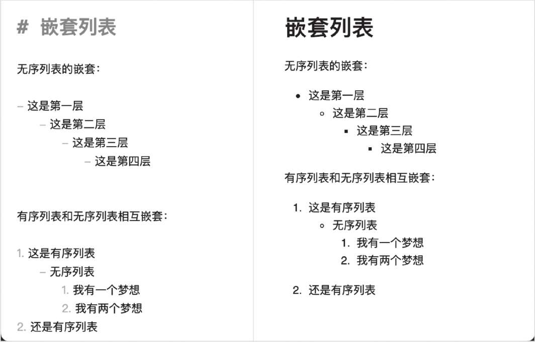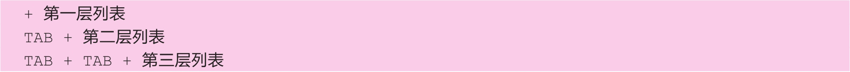 列表中可以嵌套列表,有序列表和无序列表也可以互相嵌套。嵌套列表示例如图3-9所示,嵌套列表的语法如下。