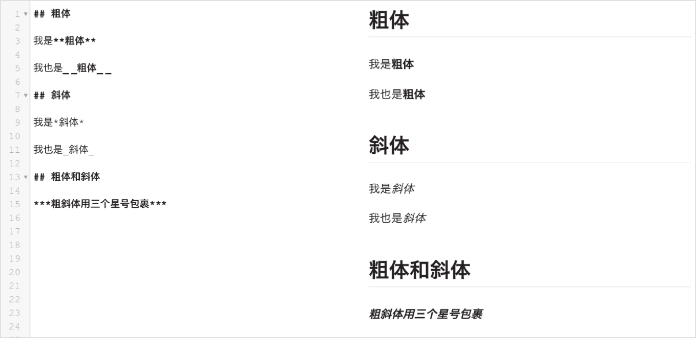 粗体和斜体用来表示强调,特别是粗体,在排版中是画龙点睛之笔,应用最为广泛。在Markdown中,粗体和斜体由星号或下画线标记。