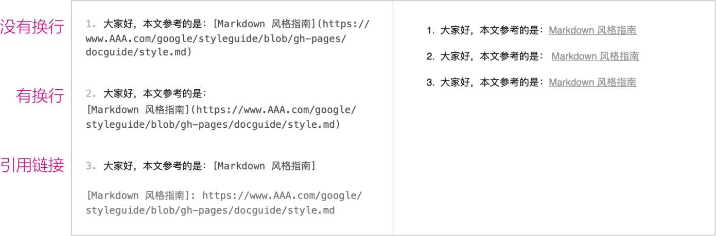 规范2 :当URL较长时换行。URL较长会导致行字符数量过多而显得混乱,可以在URL之前加一个换行符,这样既不影响渲染效果,又能提升可读性。例如: