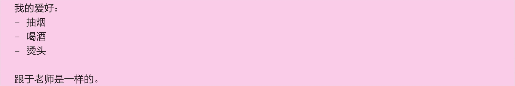 规范2 :如果一个列表中所有的列表项都没有换行,则建议在列表的开头使用-加1个空格。