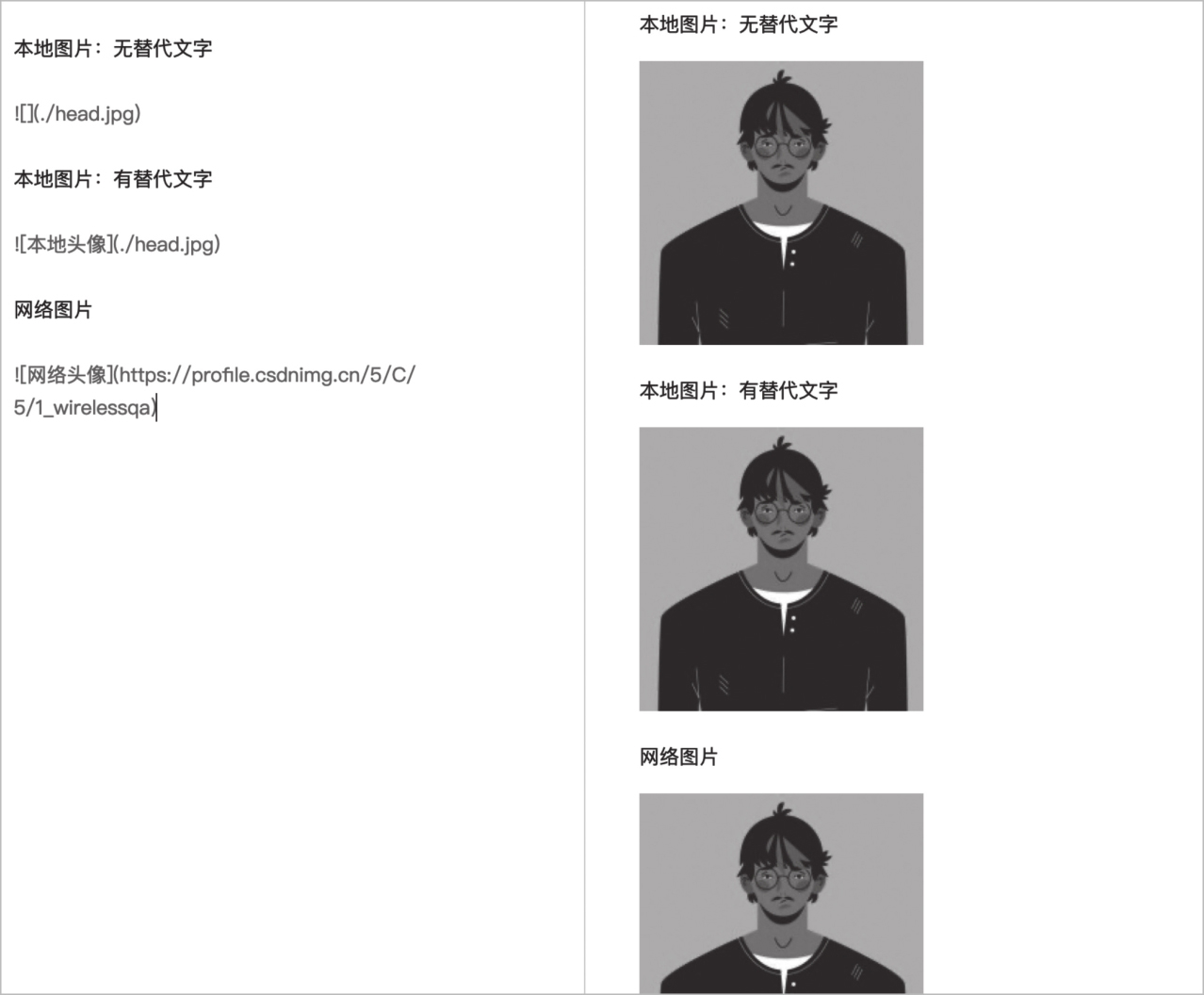 一图胜千言,文章中的插图必不可少。Markdown插入图片的语法是叹号+中括号包裹图片替代文字+圆括号包裹图片地址,符号之间没有空格。基本格式如下。