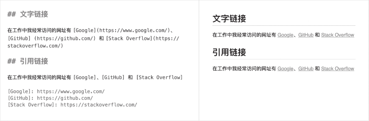 文字链接即把链接地址直接写在文本中。文字链接的语法比图片链接少了一个叹号(!), 用中括号包裹链接文字 ,后面紧接着圆括号包裹的链接地址,如图3-16所示,语法格式如下。