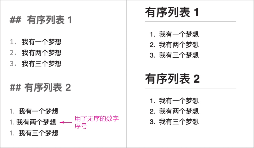 有序列表中的数字序号既可以是有序的,也可以是相同的或无序的,最终渲染的效果都一样。但为了可读性,建议用有序的数字序号标记有序列表,这与最终的渲染效果一致。实例演示如图3-7所示。