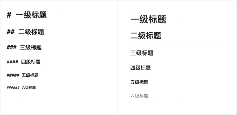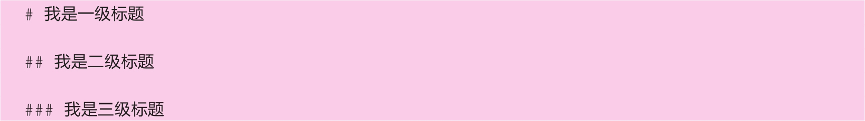 在行首插入井号(#)来标记标题,#的个数不同表示不同的标题等级,一个#表示一级标题,两个#表示二级标题,依此类推,最多支持六级标题,如图3-2所示。语法格式如下。