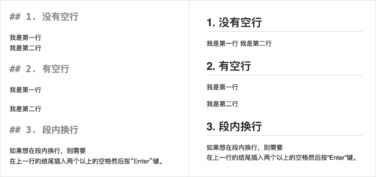 ●如果想在段内换行,则需要在上一行的结尾插入两个以上的空格然后按“Enter”键。