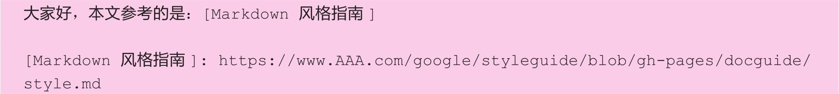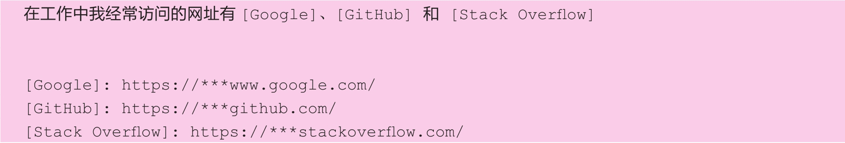 对于这种情况,先把链接地址在某个地方统一定义好,然后在正文中通过“变量”来引用的方法叫 引用链接 。 引用链接 主要分为两步。