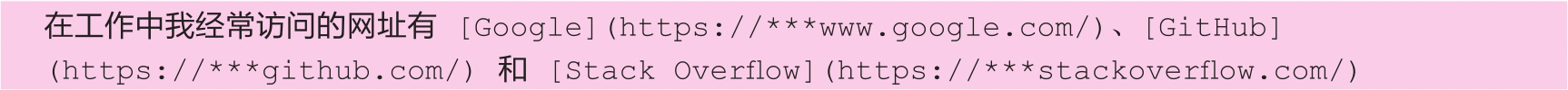文字链接即把链接地址直接写在文本中。文字链接的语法比图片链接少了一个叹号(!), 用中括号包裹链接文字 ,后面紧接着圆括号包裹的链接地址,如图3-16所示,语法格式如下。