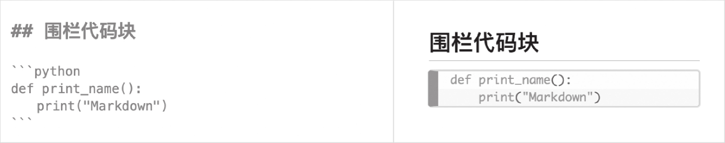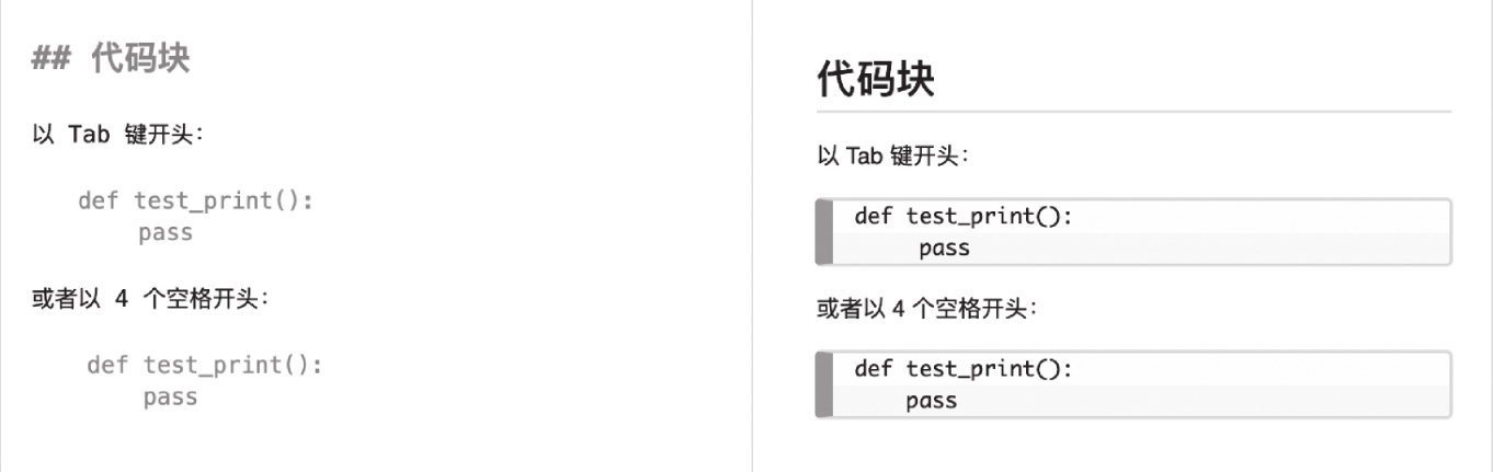 代码块是单独的代码片段。在Markdown中,代码块以Tab键或4个空格开头,如图3-21所示,语法格式如下。