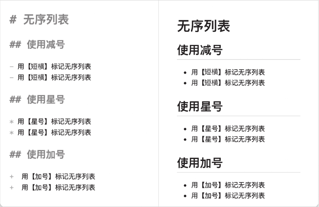 无序列表由“短横(-)、星号(*)、加号(+)+空格+列表内容”标记,语法格式如下。