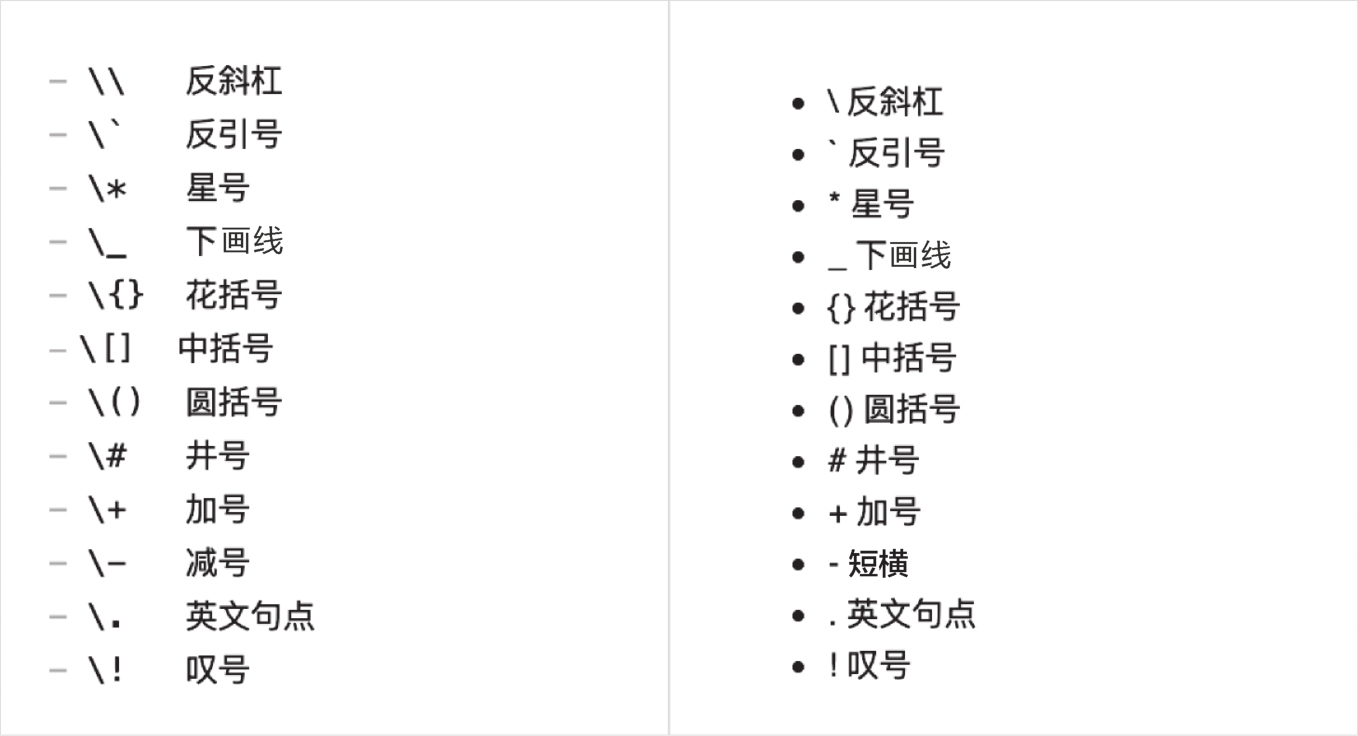 Markdown可以使用标记符号来标记内容,但如果内容本身就是标记符号怎么办呢?例如,内容为星号(*)、井号(#)、减号(-)等。如果不想让这些符号被渲染,那么除了使用反引号(`)把特殊符号当成行内代码包裹,还可以使用反斜杠(\)将这些符号转义。语法格式如下。