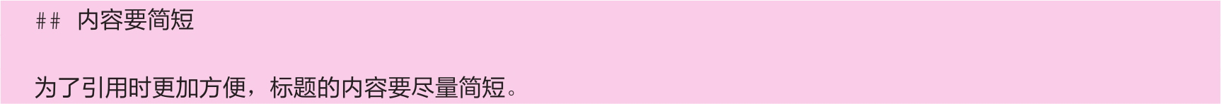 规范5 :标题要尽量简短,便于生成目录时引用。如果标题是一个长句,那么可以从长句中提取标题,将长句作为标题下的内容。