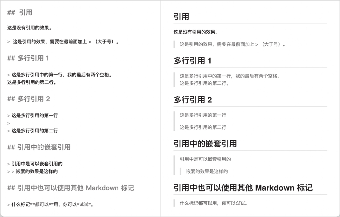 引用的语法是大于号(>)+引用内容,语法格式如下。