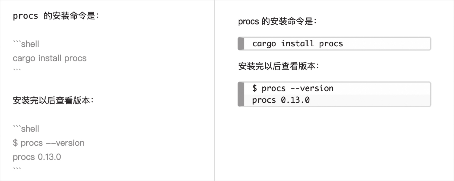 规范2 :如果代码超过1行,则请使用围栏代码块(扩展语法),并显式地声明语言,这样做既便于阅读,也便于显示语法高亮。推荐用法如图3-23所示。
