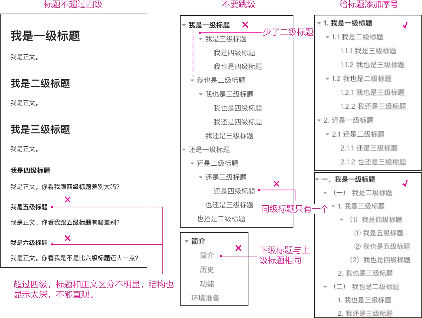 一般建议标题不超过四级,如果再多就会导致标题字号与正文字号接近,容易分不清标题和正文。为了层次分明,为标题使用不同的颜色或加上图标是比较常用的做法。还要注意,下级标题的内容不能与上级标题相同,标题要逐级递增,不要跳级,否则看起来逻辑混乱。为了增强逻辑关系,也可以给标题添加序号,但要避免同级标题下只有一个编号,如图1-4所示。