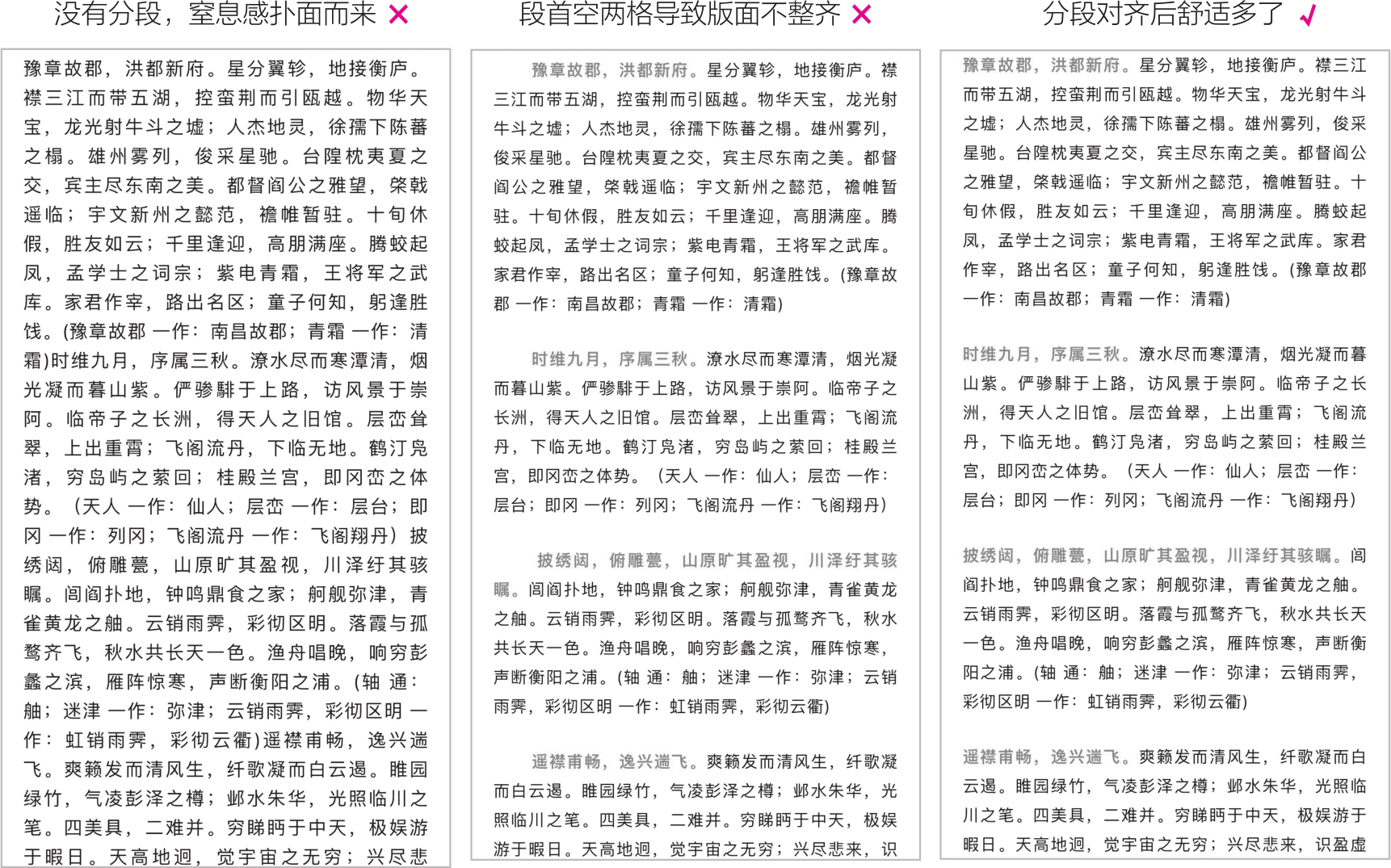 如果段落太长,看着就很累,而且很容易看岔行。为了实现更好的阅读体验,一般建议每段文字有3~5行,当然,再多两行也可以。切记不要全屏塞满文字,否则会给人一种窒息的感觉。