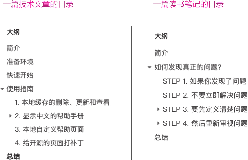 文章要有标题,特别是长文,标题能起到导航作用。不管是读书还是读文章,很多人的习惯是通过目录来了解整体结构,再细品或选择性地阅读。目录就是由标题构成的,模糊的标题如同错误的路标,不仅无法引导读者,反而会加速他们的离开。所以标题要能像思维导图一样,展现文章的整体思路,如图1-3所示。