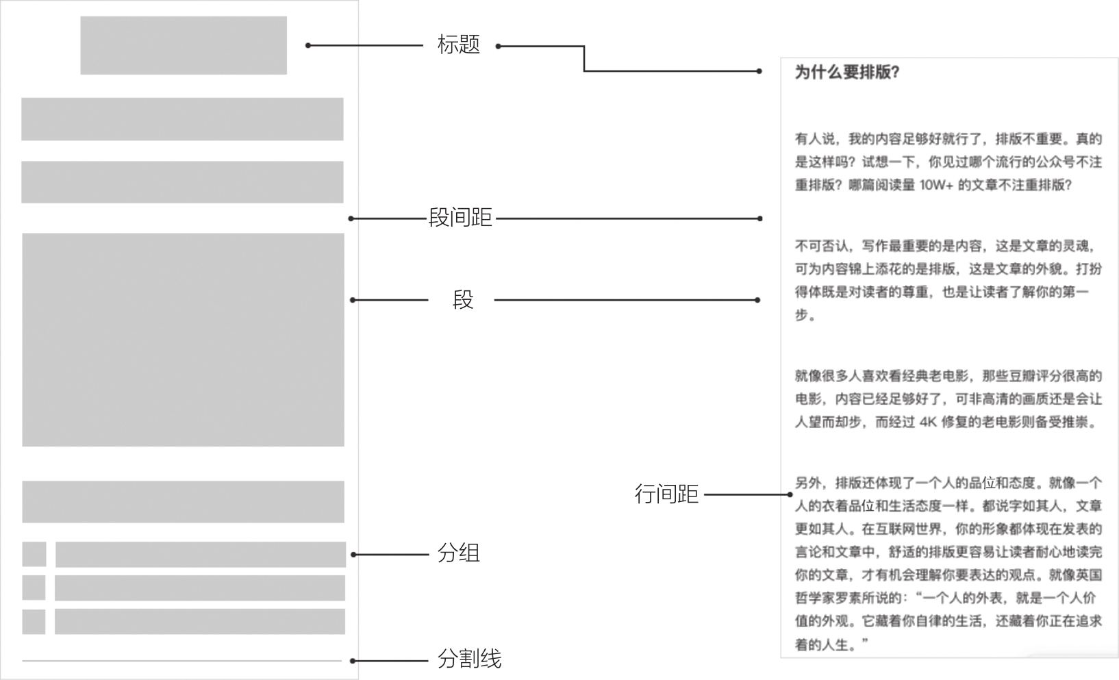 一篇文章可以看作一个个模块的组合,这些模块由标题、段落、空行、分组信息和分割线组成,按照一定的逻辑排列在一起,搭建起了文章的整体结构。逻辑清晰、排版舒适的结构,有助于提升文章的信息传递效率和读者的阅读体验,如图1-2所示。