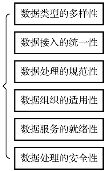 围绕数据接入的标准化,相关模块的指标构成包括具备支持结构化数据、半结构化数据、非结构化数据的数据接入能力;数据接入工具符合统一的标准规范;支持多种标准化、模块化、可适配的数据接入模式,满足多源异构数据的采集与汇聚;支持数据批量接入。