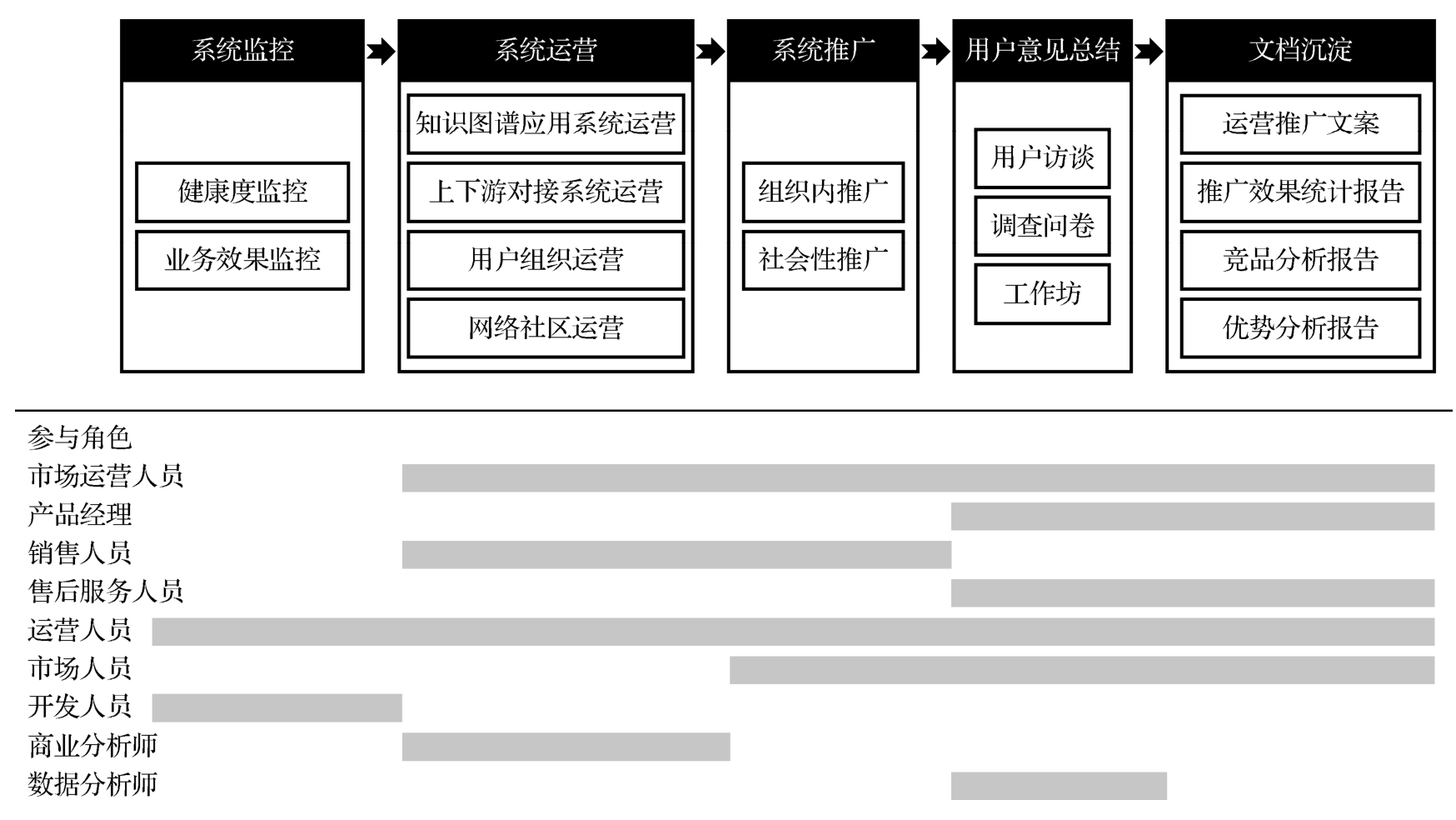 运营推广阶段是在实际生产环境中验证知识图谱应用系统效果,并进行用户运营和市场推广的重要阶段。该阶段根据拟实现目标的不同可划分为系统监控、系统运营、系统推广、用户意见总结、文档沉淀5项活动。运营推广阶段活动流程及主要参与角色如图5.8所示。